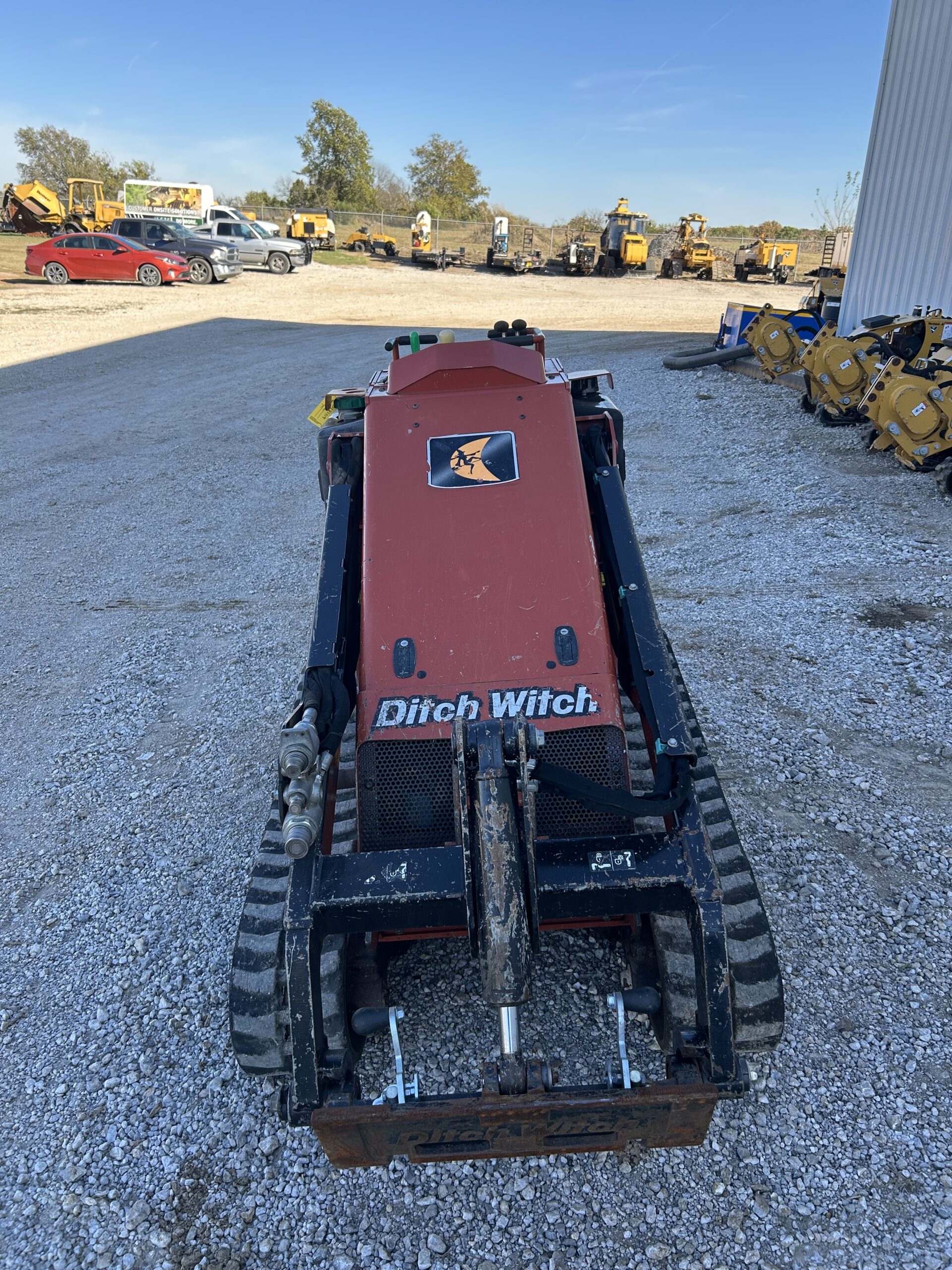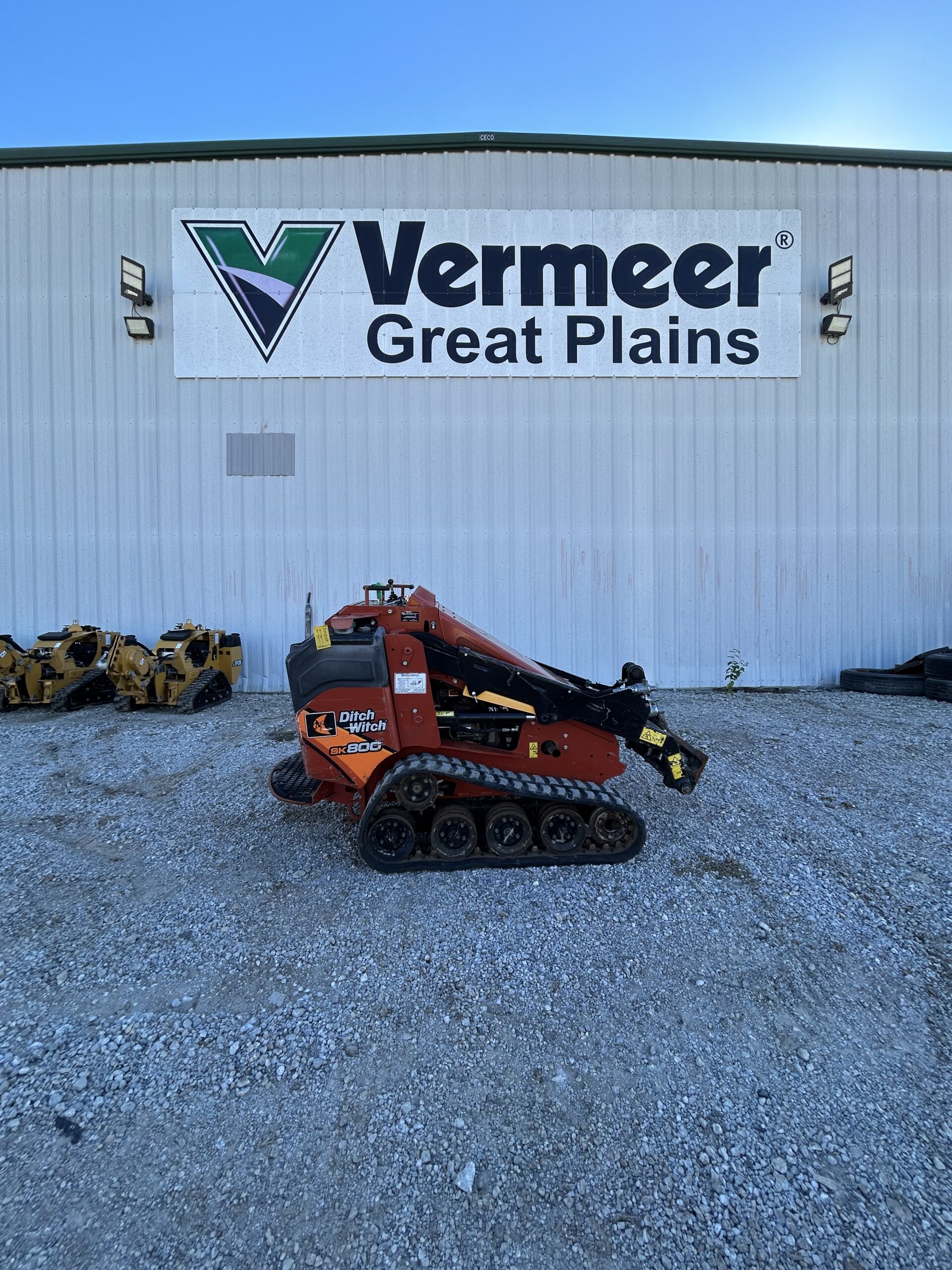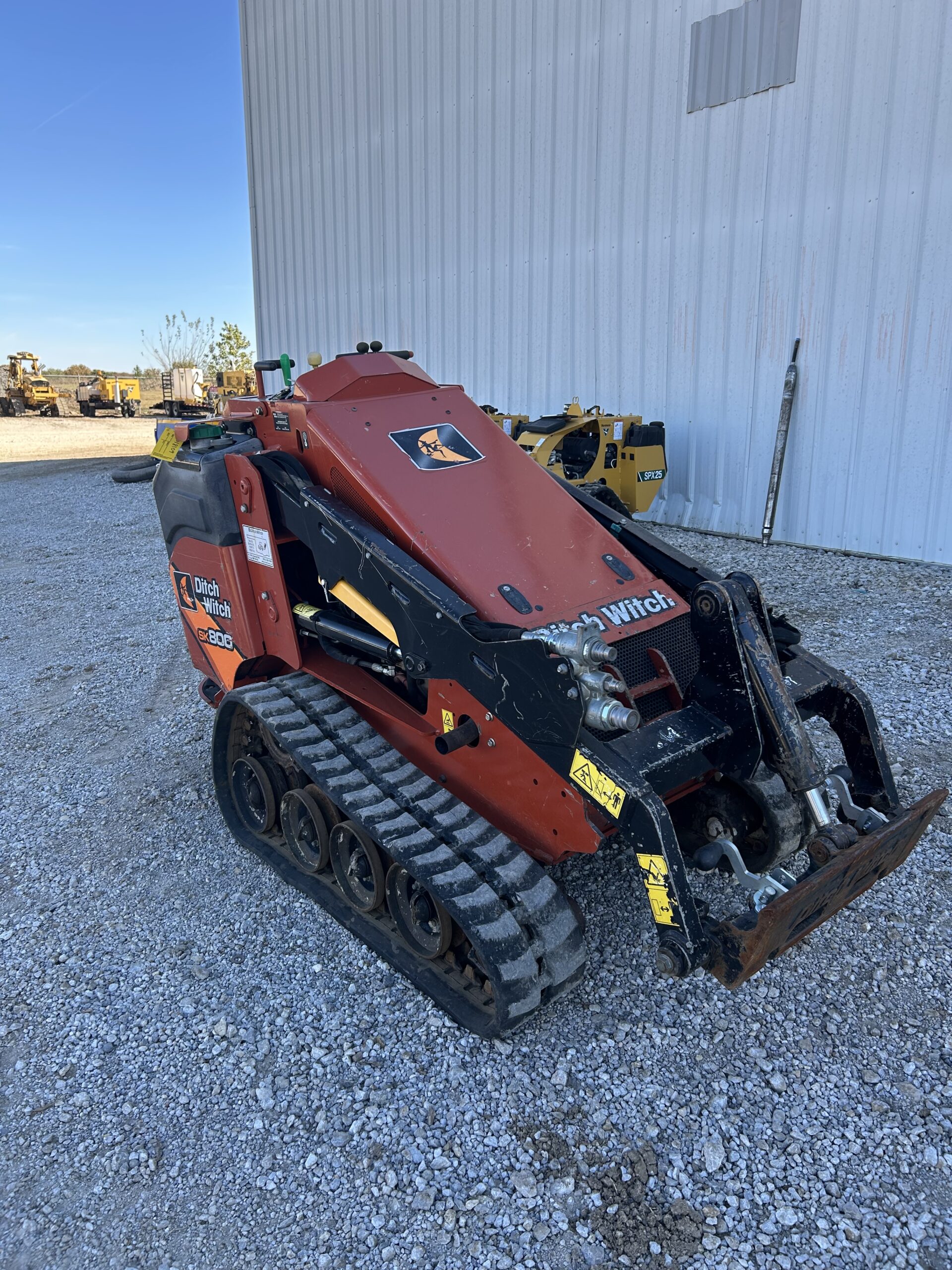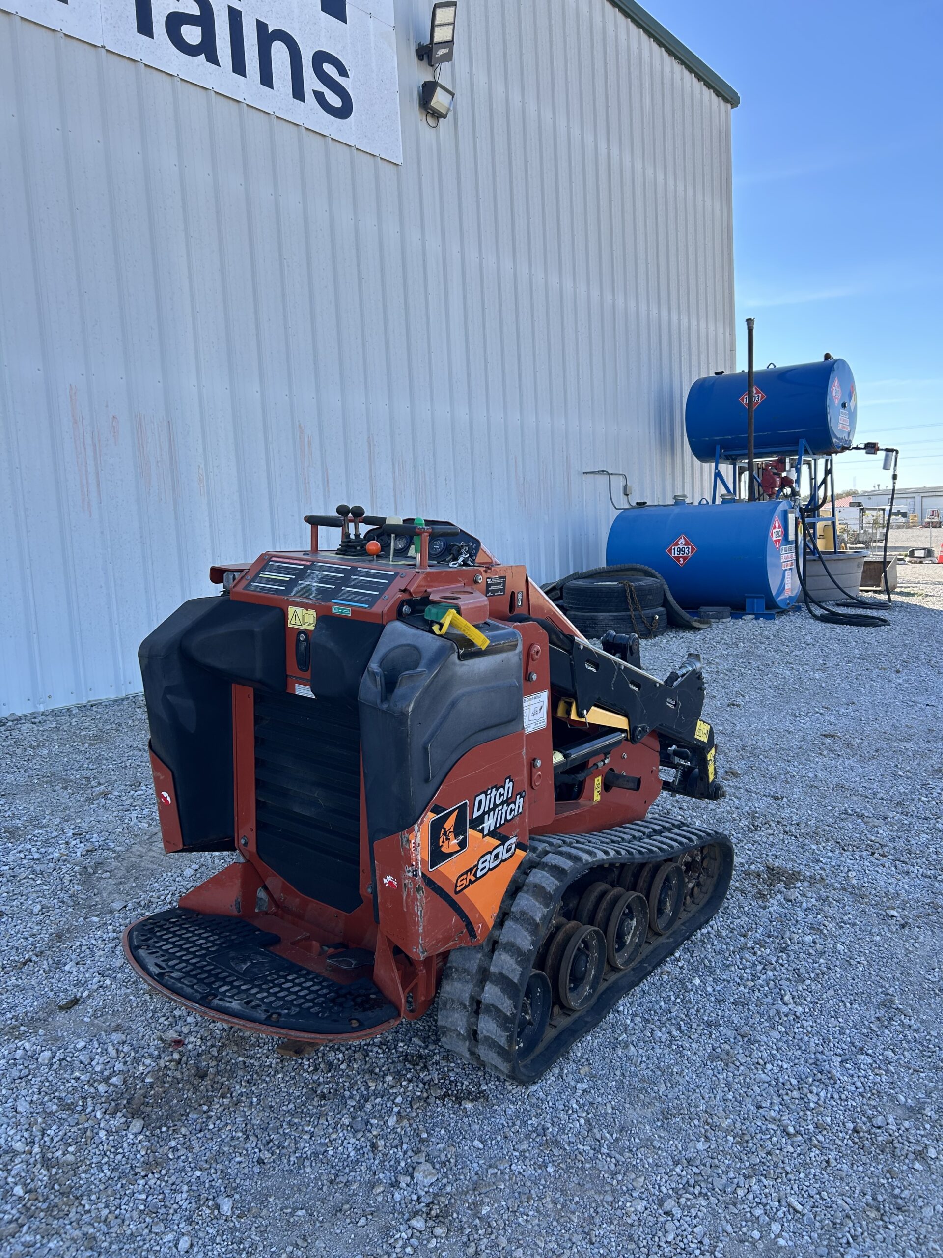 The Ditch Witch SK800 Mini Skid Steer features a 24.8-hp Kubota diesel engine, an operating capacity of 911 lbs, and a hinge-pin height of 83 inches. It has a ground drive speed of 4.8 mph in both forward and reverse, making it suitable for various heavy-duty tasks